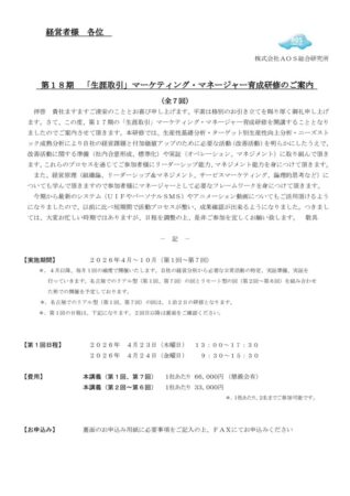 厚く御礼申し上げます。さて、この度、「生涯取引」マーケティングマネージャー研修を下記